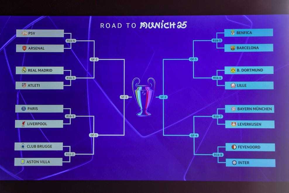 北京时间2月21日,2024-25赛季欧冠1/8决赛抽签结果出炉,直至决赛对阵已经成型,内容如下图所示: